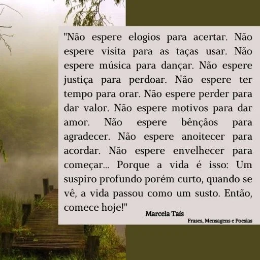 "Não espere elogios para acertar. Não espere visita para as taças usar. Não espere música para dançar. Não espere justiça para perdoar. Não espere ter tempo para orar. Não espere perder para dar valor. Não espere motivos para dar amor. Não espere bênçãos para agradecer. Não espere anoitecer para acordar. Não espere envelhecer para começar… Porque a vida é isso: Um suspiro profundo porém curto, quando se vê, a vida passou como um susto. Então, comece hoje!"